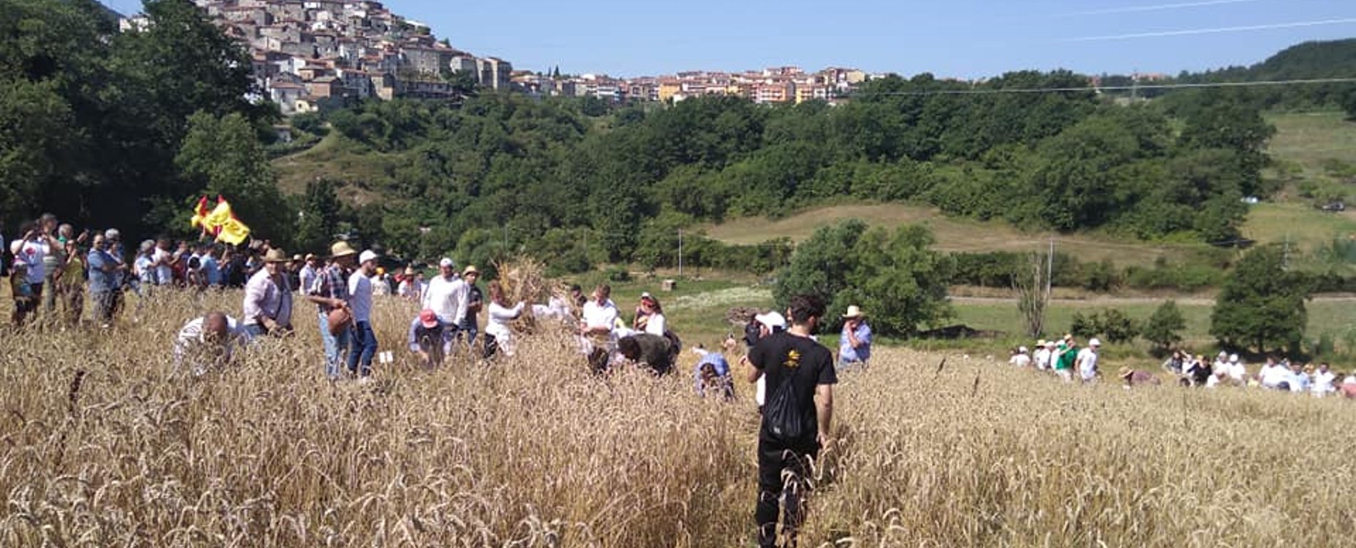 Un palio che dal centro storico butta tutti e tutte nelle terre, anziani esperti, giovani a seguito, curiosi e cumpari in una gara di contrade che si fa gara di altri mondi, quelli di comuni vicini, di regioni vicine, di altri paesi. Grano da tagliare, mietere, trebbiare, grano giallo da mangiare e ballare.