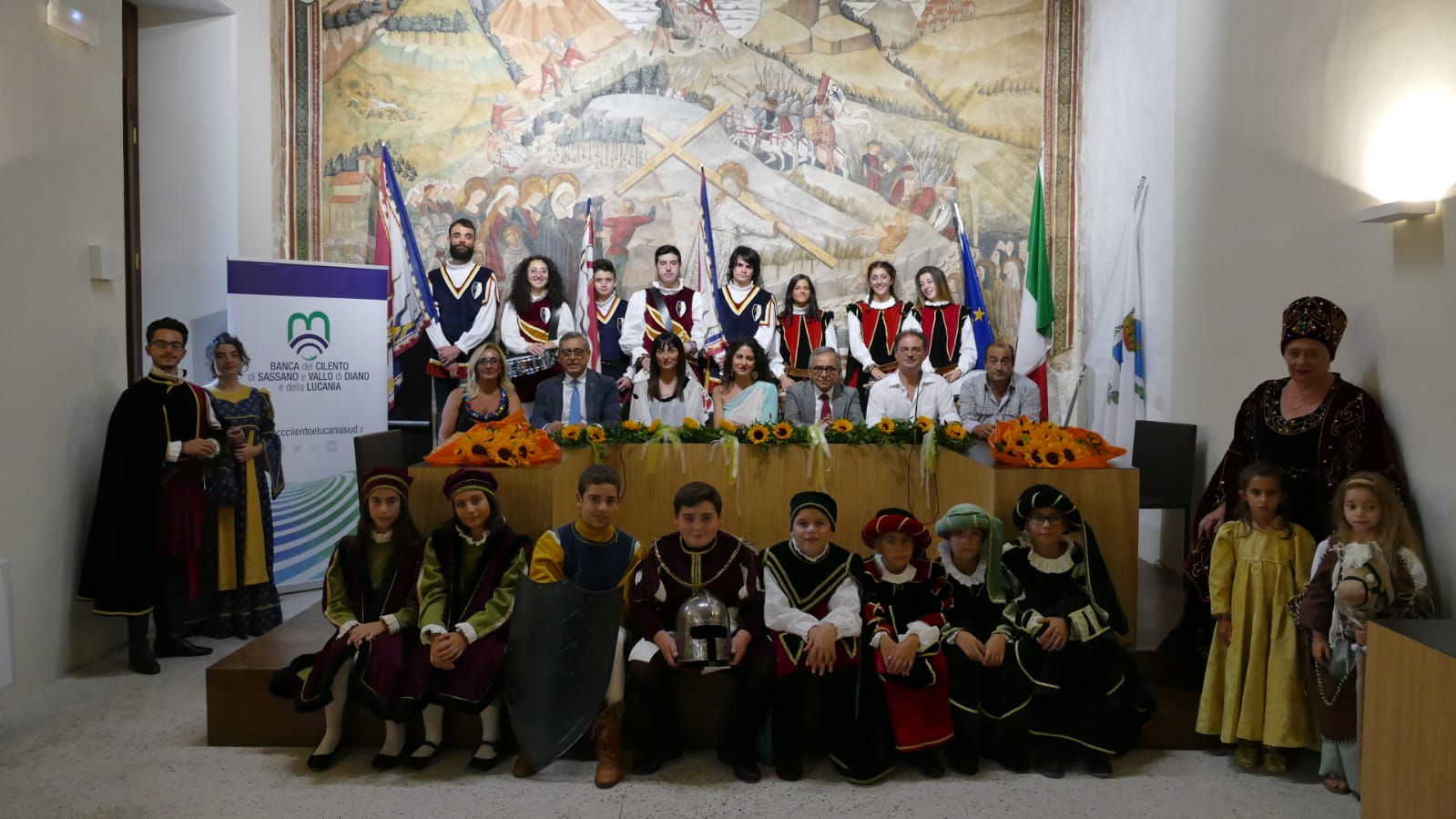 La 25^ edizione de “Alla Tavola della Principessa Costanza” rappresenta un importante salto di qualità nella collaborazione tra la Pro Loco Teggiano e la Banca del Cilento, di Sassano e Vallo di Diano e della Lucania, divenuta il principale sponsor della kermesse. Non a caso: la storia della famiglia Sanseverino coincide per territorialità all’area di competenza della Banca del Cilento. Per l’Istituto Bancario con sede a Vallo della Lucania alla conferenza stampa di presentazione sono intervenuti il Presidente Pasquale Lucibello, la Vicepresidente Rosa Lefante ed il Direttore Generale Ciro Solimeno. “Conoscevamo bene questa manifestazione –ha sottolineato il presidente Lucibello– e ne eravamo innamorati per il valore culturale, per l’imponenza e per tutte le altre caratteristiche che la rendono unica. Dopo la collaborazione avviata negli scorsi anni avevamo la volontà di accompagnare in modo ancora migliore questo bellissimo evento, contribuendo a farlo crescere ancora di più. Oltre all’aspetto culturale –ha concluso il Presidente della Banca del Cilento- non va dimenticato quello turistico, ed il nostro impegno è anche per far arrivare a Teggiano quanti più visitatori possibili”.