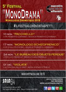 C’è un solo Festival di Teatro indipendente professionistico del Sud della Provincia di Salerno, un unico Festival che non riceve contributi pubblici e privati, dimostrando di fatto che l’Arte Teatrale non ha bisogno primario ed assoluto di assistenzialismo, ma necessita obbligatoriamente di capacità e qualità. A Sala Consilina torna “MonoDrama” Monologue Dramatique, promosso e prodotto ancora una volta dall’Associazione Culturale Cooperativa Culturale La Cantina delle Arti. La quinta edizione del Festival si svolgerà anche quest’anno presso la “SALA94” della Casa/Cantina, in via Luigi Sturzo, dopo il grande successo delle precedenti edizioni. Quattro domeniche, 10, 17, 24 novembre e 1 dicembre 2019, alle ore 18:15, vedranno in scena quattro spettacoli di grande qualità artistica. Il Festival “MonoDrama”, dal greco mono/solo, drama/azione si pone di dare spazio artistico ad un genere teatrale tornato in voga nell’ultimo ventennio, dove il rapporto primario dell’Arte teatrale, Attore/Spettatore/Spazio, meglio si evidenzia.