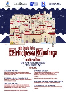 Il Progetto è frutto della sinergia tra il Comune di Teggiano e la Pro Loco Teggiano, ed è stato finanziato dal Ministero per i Beni e le Attività Culturali, nell’ambito del Fondo Nazionale per la Rievocazione storica 2019. Parallelamente, grazie al progetto “Percorsi dell’Anima”, voluto dall’Assessorato Regionale al Turismo della Regione Campania guidato da Corrado Matera, in Piazza San Cono sono state collocate le splendide statue alte circa due metri del Presepe della Misericordia dell’Abbazia di Montevergine, precedentemente esposte soltanto in Vaticano, in Piazza San Pietro, e ad Assisi, nella Piazza Inferiore. Il quadro della Natività ha trovato naturale accoglienza nel Seggio, che sorge all’incrocio del Cardo e del Decumano, e che rappresenta la destinazione finale del Corteo Storico de “Alla Tavola della Principessa Costanza” Winter Edition. La collaborazione con l’Assessore Matera e con la Regione Campania ha consentito anche l’allestimento delle splendide luminarie, che contribuiscono a rendere la visita a Teggiano “Winter Edition” unica ed emozionante.