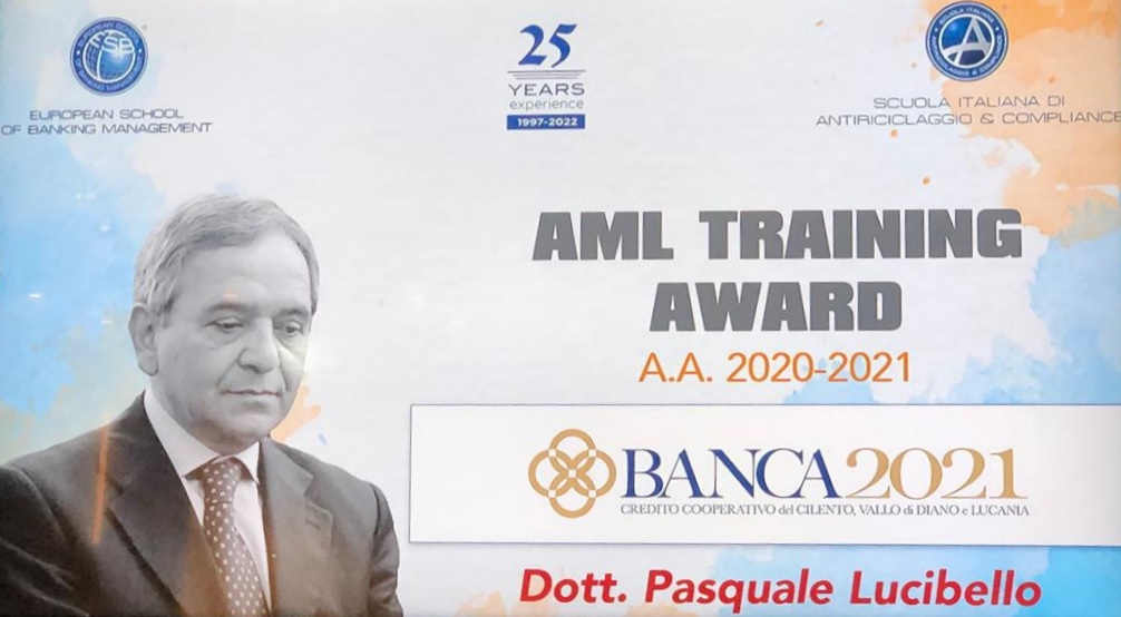 In attesa della cerimonia di consegna dei 16 attestati, che proprio in considerazione del numero molto consistente la European School of Banking Management ha programmato per il mese di dicembre a Vallo della Lucania, la Banca 2021 -Credito Cooperativo del Cilento, Vallo di Diano e Lucania- è stata premiata dal prestigioso Istituto con l’importante riconoscimento dell’AML Training Awards. Il Premio è stato conferito nel corso della cerimonia di inaugurazione dell’Anno Accademico 2021/22 svoltasi a Milano, presso l’Hotel Lombardia. In rappresentanza della Presidenza e della Direzione Generale della Banca 2021, destinatari dei riconoscimenti, hanno preso parte all’importante evento Giuseppe Nese, Responsabile Marketing, Stefano Antonello Aumenta, Responsabile Nucleo Supporto e Mitigazione Rischio Riciclaggio, e Claudio Bloise, Responsabile del Personale, che hanno partecipato anche alla Tavola Rotonda dal titolo: “Dai Pandora Papers alla VI Direttiva AML. Come sta cambiando il mondo dell’Antiriciclaggio in ambito domestico e internazionale”.
