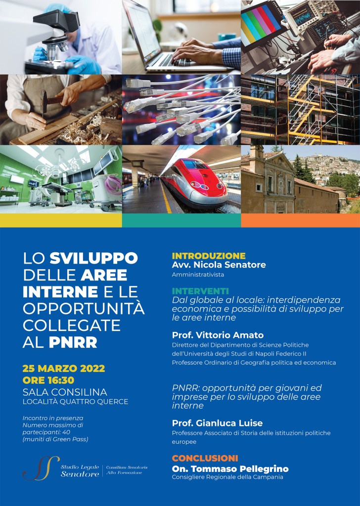 Venerdì 25 marzo, alle 16.30, presso l’aula di Alta formazione “Consilium Senatoris” di Sala Consilina, si terrà il convegno dal titolo “Lo sviluppo delle aree interne e le opportunità collegate al PNRR”.