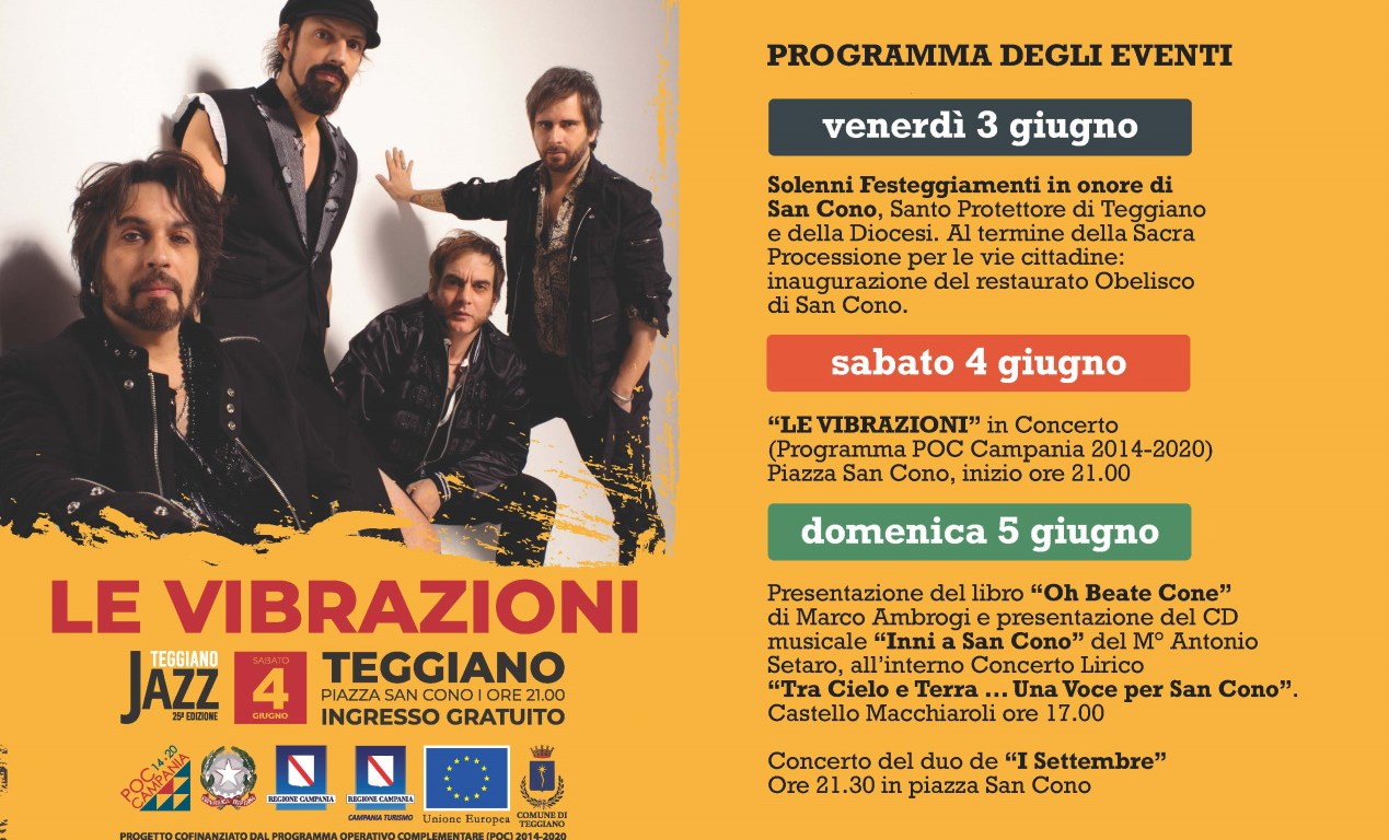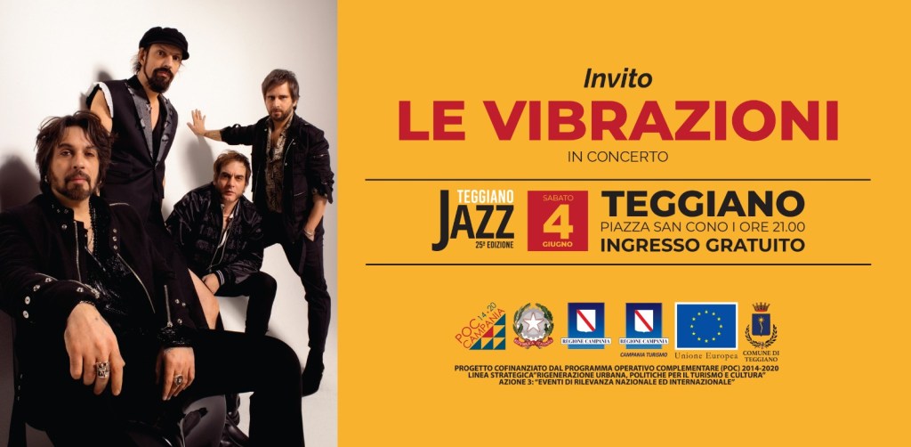 In un contesto così fortemente emozionante e partecipativo, si intrecciano le suggestioni della 25^ edizione di “Teggiano Jazz”, realizzati grazie al finanziamentoPOC 2014/20, Linea Strategica “Rigenerazione Urbana, Politiche per il Turismo e Cultura”, Azione 3 “Eventi di Rilevanza Nazionale ed Internazionale”. La manifestazione negli anni pre-pandemici ha proposto un cartellone orientato verso molteplici dimensioni musicali, diventando un punto di riferimento nel panorama campano. Quest’anno ritorna ad offrire grandissima musica, ospitando il 4 giugno uno dei gruppi di riferimento del panorama musicale italiano: Le Vibrazioni. Il concerto avrà inizio alle ore 21:00 in Piazza San Cono, con ingresso libero.