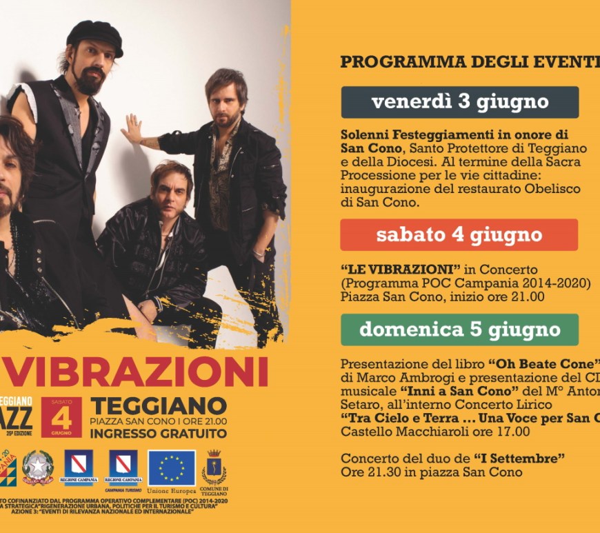Cresce l’attesa a Teggiano per il Concerto de “Le Vibrazioni”, in programma questa sera nell’ambito della rassegna “Teggiano Jazz” 25^ edizione. Inizia un fine settimana da “sold out” nella città museo del Vallo di Diano che, dopo le restrizioni dettate dell’emergenza pandemica, riapre la sua meravigliosa piazza San Cono ai grandi eventi collettivi, tornando ad essere il perfetto crocevia di tradizione, arte, armonia e suoni. … Continua a leggere Teggiano, fine settimana da “sold out” con Teggiano Jazz e Le Vibrazioni