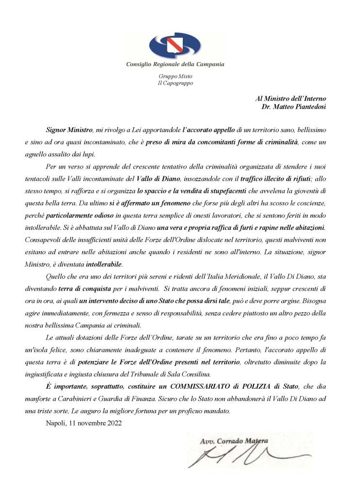 “Signor Ministro -scrive Matera- mi rivolgo a Lei apportandole l’accorato appello di un territorio sano, bellissimo e sino ad ora quasi incontaminato, che è preso di mira da concomitanti forme di criminalità, come un agnello assalito dai lupi. Per un verso, si apprende del crescente tentativo della criminalità organizzata di stendere i suoi tentacoli sulle Valli incontaminate del Vallo di Diano, insozzandole con il traffico illecito di rifiuti; allo stesso tempo, si rafforza e si organizza lo spaccio e la vendita di stupefacenti che avvelena la gioventù di questa bella terra. Da ultimo -continua il Consigliere Regionale- si è affermato un fenomeno che forse più degli altri ha scosso le coscienze, perché particolarmente odioso in questa terra semplice di onesti lavoratori, che si sentono feriti in modo intollerabile. Si è abbattuta sul Vallo di Diano una vera e propria raffica di furti e rapine nelle abitazioni. Consapevoli delle insufficienti unità delle Forze dell’Ordine dislocate nel territorio, questi malviventi non esitano ad entrare nelle abitazioni anche quando i residenti ne sono all’interno. La situazione, signor Ministro, è diventata intollerabile”.