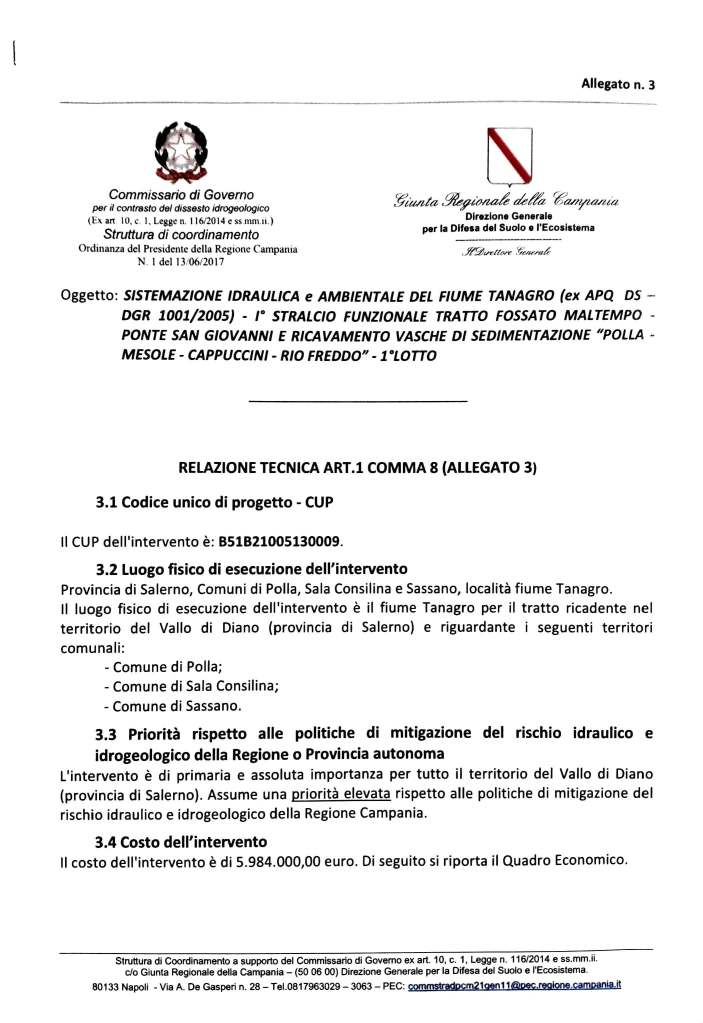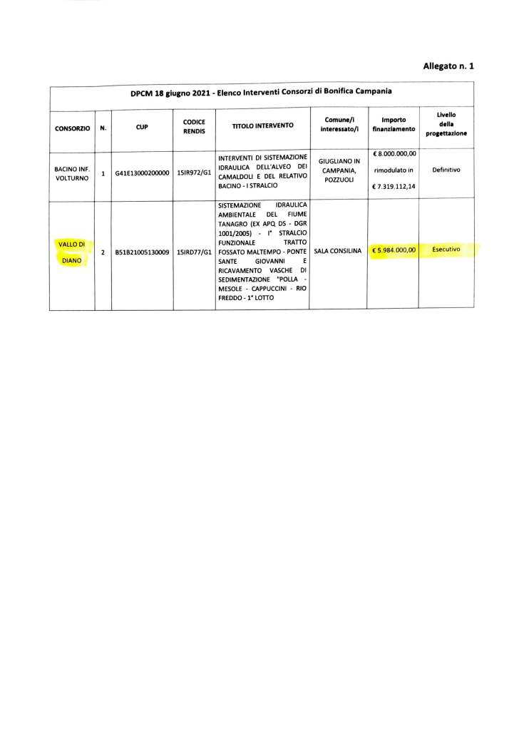Lo rende noto il Consigliere Regionale Corrado Matera, sottolineando inoltre gli atti concreti, approvati e finanziati, sui quali ha già lavorato e continuerà a lavorare per ciò che è di propria competenza: “Per la sicurezza del Fiume Tanagro -sottolinea Matera- la Regione Campania ha approvato un progetto per lavori strutturali (presentato dal Consorzio di Bonifica Vallo di Diano-Tanagro) per circa 12 milioni di euro. Per i primi 6 milioni di euro (cfr. delibera Giunta Regionale numero 169 del 06/04/2022) si è in attesa del decreto di trasferimento dei fondi alla Regione Campania da parte della Presidenza del Consiglio dei ministri, per far partire la gara di appalto”.
