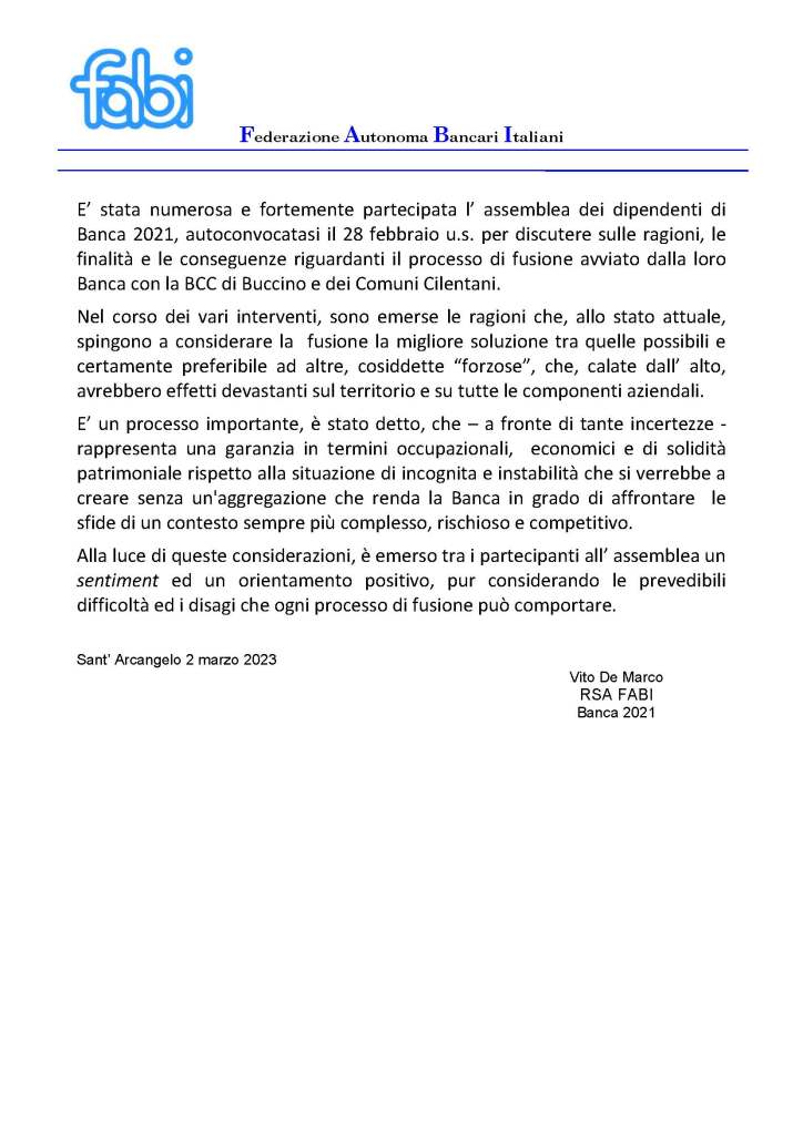 “È stata numerosa e fortemente partecipata l’Assemblea dei dipendenti di Banca 2021, autoconvocatasi il 28 febbraio per discutere sulle ragioni, le finalità e le conseguenze riguardanti il processo di fusione avviato dalla loro Banca con la BCC di Buccino e dei Comuni Cilentani”. Lo rende noto l’organizzazione sindacale “Federazione Autonoma Bancari Italiani”, attraverso una nota stampa a firma di Vito De Marco, della Rappresentanza Sindacale Aziendale.