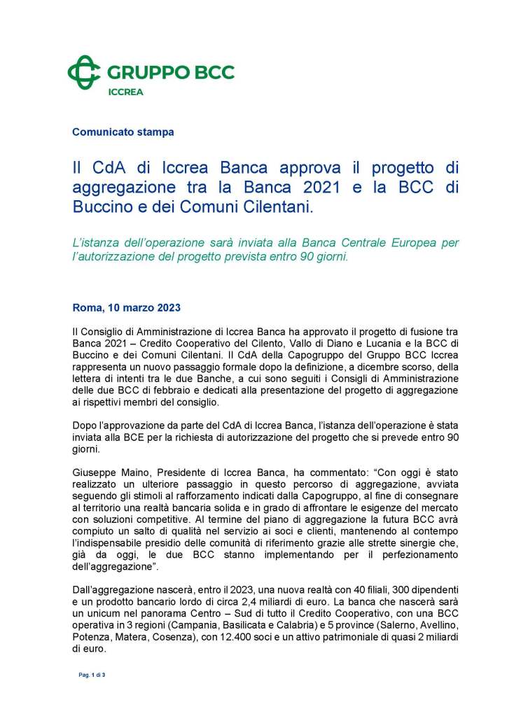 Il Consiglio di Amministrazione di Iccrea Banca ha approvato il progetto di fusione tra Banca 2021 – Credito Cooperativo del Cilento, Vallo di Diano e Lucania e la BCC di Buccino e dei Comuni Cilentani.