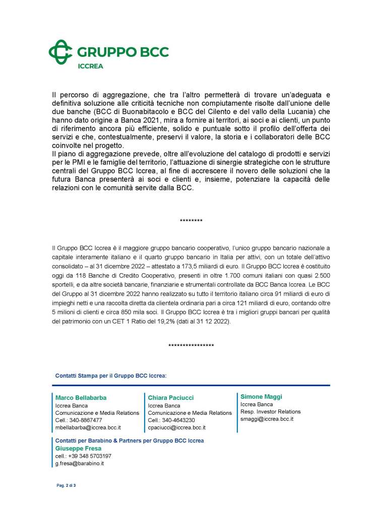 Il percorso di aggregazione, che tra l’altro permetterà di trovare un’adeguata e definitiva soluzione alle criticità tecniche non compiutamente risolte dall’unione delle due banche (BCC di Buonabitacolo e BCC del Cilento e del vallo della Lucania) che hanno dato origine a Banca 2021, mira a fornire ai territori, ai soci e ai clienti, un punto di riferimento ancora più efficiente, solido e puntuale sotto il profilo dell’offerta dei servizi e che, contestualmente, preservi il valore, la storia e i collaboratori delle BCC coinvolte nel progetto.