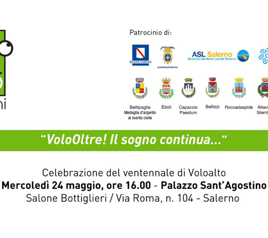 Mercoledì 24 maggio 2023, alle ore 16.00, presso il Salone Bottiglieri di Palazzo Sant’Agostino a Salerno, si terrà l’evento “VoloOltre! Il sogno continua…”, per il ventennale della Cooperativa sociale “Voloalto” di Battipaglia, che si occupa di inclusione e inserimento sociale e lavorativo delle categorie svantaggiate, in particolare utenti psichiatrici e minori. Nei vent’anni di attività, “Voloalto” ha lavorato in convenzione con vari Piani di Zona, … Continua a leggere IL VENTENNALE DELLA COOPERATIVA SOCIALE “VOLOALTO” A PALAZZO SANT’AGOSTINO