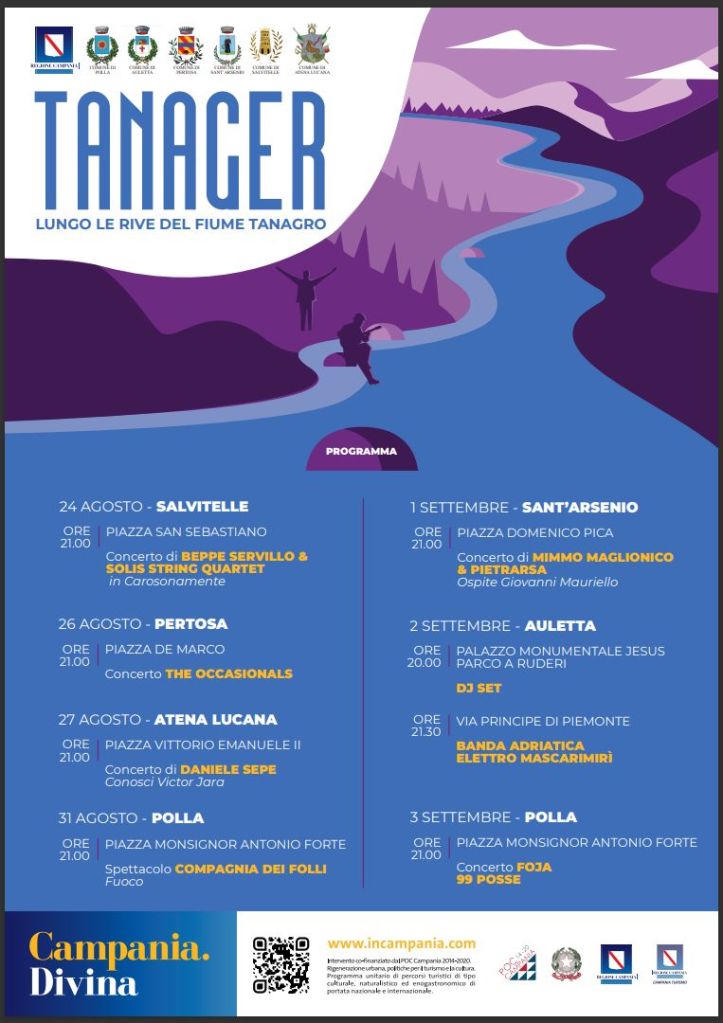 TANAGER è un itinerario tematico che esalta tutte le bellezze naturali e storico-culturali presenti nel territorio di riferimento e la sua promozione. I luoghi corrispondono ai territori comunali degli enti promotori: i Comuni di POLLA – capofila-, ATENA LUCANA, AULETTA, PERTOSA, SALVITELLE e SANT’ARSENIO. Il minimo comune denominatore è rappresentato dal patrimonio culturale e naturalistico proprio delle civiltà sviluppatesi lungo il fiume Tanagro. Anche quest’anno gli eventi live la faranno da padrone: un ricco calendario che attinge dalla scena folk, jazz e pop, del panorama musica italiano.