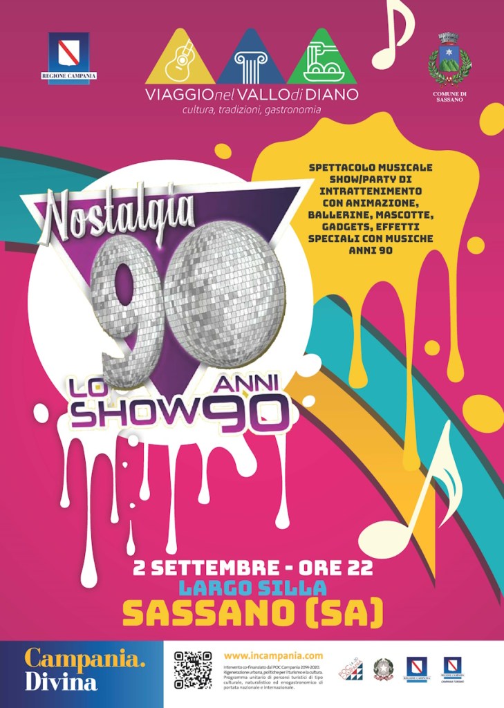 “Il Comune di Sassano -spiega il primo cittadino Domenico Rubino– nell’ambito del progetto “Viaggio nel Vallo di Diano” ha inserito due proposte importanti. La prima, in programma sabato 2 settembre, è finalizzata alla valorizzazione della frazione di Silla, e già il titolo “Nostalgia ‘90” fa capire che si tratterà di un evento capace di coinvolgere molteplici generazioni. La musica indimenticabile degli anni ’90 sarà protagonista, insieme a tante altre sorprese che movimenteranno una serata da trascorrere tutti insieme, in allegria. Invito quindi tutti a venire sabato 2 settembre nella stupenda location della Villa Comunale di Silla di Sassano, una delle più belle della provincia salernitana”.
