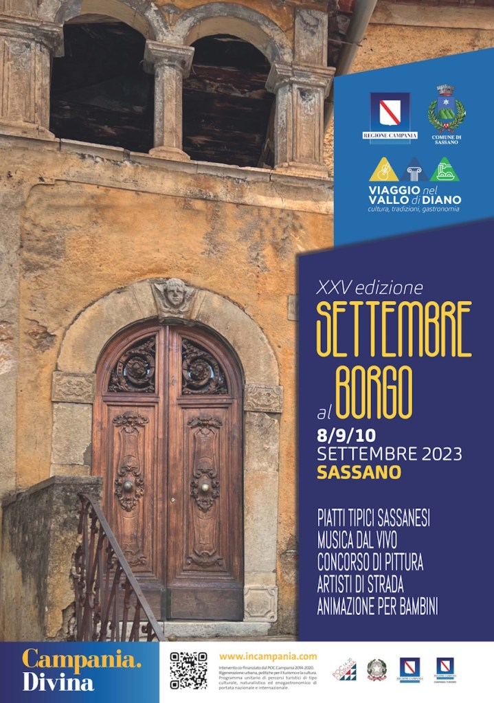• Il “Concorso di pittura su tela” che si svolgerà in collaborazione con i giovani studenti del Liceo Artistico “P. Leto” di Teggiano, coordinati dal Prof. Germano Torresi, presso la nuova struttura comunale. • Nel cuore del centro storico, nello spazio antistante la Chiesa Madre “S. Giovanni Battista”, sarà allestita la mostra “Sassano nella storia”, a cura della Proloco Sassano • CHIESE APERTE: - San Giuseppe - Santa Lucia - Madonna Cielo e Terra • Due le interessanti mostre allestite a Palazzo “Picinni”: - “Il Grido di Festa”, a cura del gruppo teatrale sassanese “Pasquale Petrizzo” - “Artificio e Natura”, a cura di Vincenzo Arnone • Sassano è “la città della musica”: non poteva mancare, nel corso della tre-giorni di “Settembre al Borgo”, l’esibizione dei musicisti sassanesi. • Nella giornata di domenica saranno presenti il gruppo “Voci dal Sud”, l’animazione per bambini e gli artisti di strada. “VIAGGIO NEL VALLO DI DIANO TRA CULTURA, TRADIZIONE ED ENOGASTRONOMIA” - INTERVENTO CO-FINANZIATO DALLA REGIONE CAMPANIA A VALERE SUL POC CAMPANIA 2014/2020. RIGENERAZIONE URBANA, POLITICHE PER IL TURISMO E LA CULTURA. PROGRAMMA UNITARIO DI PERCORSI TURISTICI DI TIPO CULTURALE, NATURALISTICO ED ENOGASTRONOMICO DI PORTATA NAZIONALE ED INTERNAZIONALE.
