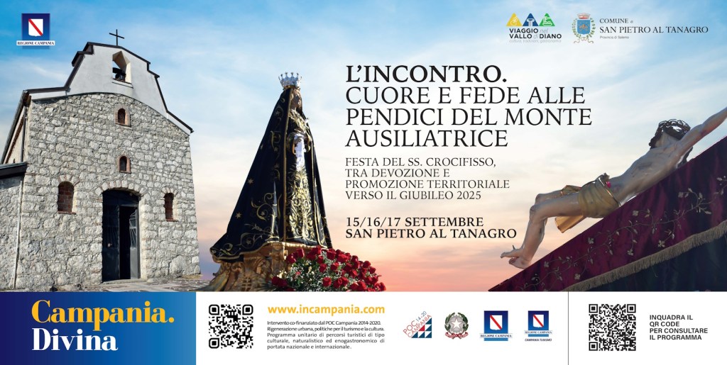 Un altro “Incontro” molto importante è in programma venerdì 15 settembre, quando a San Pietro al Tanagro giungeranno le delegazioni dai Sindaci dei Comuni che aderiscono all’Associazione Nazionale “Città del SS. Crocifisso”, provenienti dalle Regioni Campania, Basilicata, Puglia, Calabria e Sicilia. San Pietro al Tanagro e la sua proposta legata al turismo e al pellegrinaggio religioso calamiteranno l’attenzione nazionale in una giornata che prevede come “momento clou” l’adesione del Comune di San Pietro al Tanagro all’Associazione “Città del SS. Crocifisso”, e la conferenza “Cuore e Fede alle Pendici del Monte Ausiliatrice. Festa del SS. Crocifisso, tra devozione e promozione territoriale verso il Giubileo 2025”.