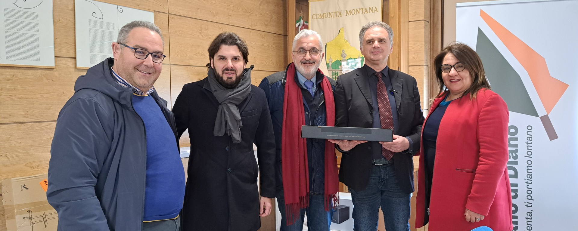 L’intervento è stato reso possibile da un finanziamento a valere sulla Strategia Nazionale per le Aree Interne. “Nell’ambito della Digitalizzazione, in uno dei progetti della SNAI, consegniamo questo kit di computer, software ed accessori ad ognuno dei comuni rientrante nel comprensorio della nostra Comunità montana” ha introdotto il presidente Cavallone. “Si tratta di una sfida che parte da lontano, che ha avuto un’accelerata con il Covid e che porta ad una sempre maggiore integrazione tra l’Ente montano e i Comuni che lo compongono”.