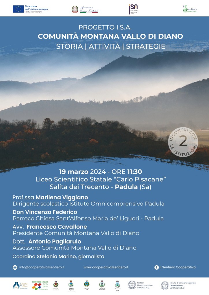 La Comunità montana Vallo di Diano incontra gli studenti del Liceo Scientifico “Carlo Pisacane” di Padula. L’appuntamento tra istituzione territoriale e mondo della scuola è stato reso possibile ieri mattina dal progetto I. S. A. – Inclusione Sostegno ed Aiuto portato avanti dalla cooperativa sociale Il Sentiero con la cooperativa L’Opera di un Altro, insieme ai partner degli istituti Omnicomprensivo di Padula ed “A. Sacco” di Sant’Arsenio.