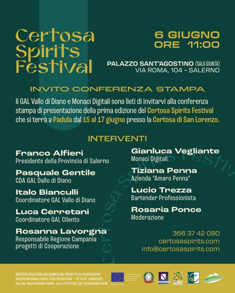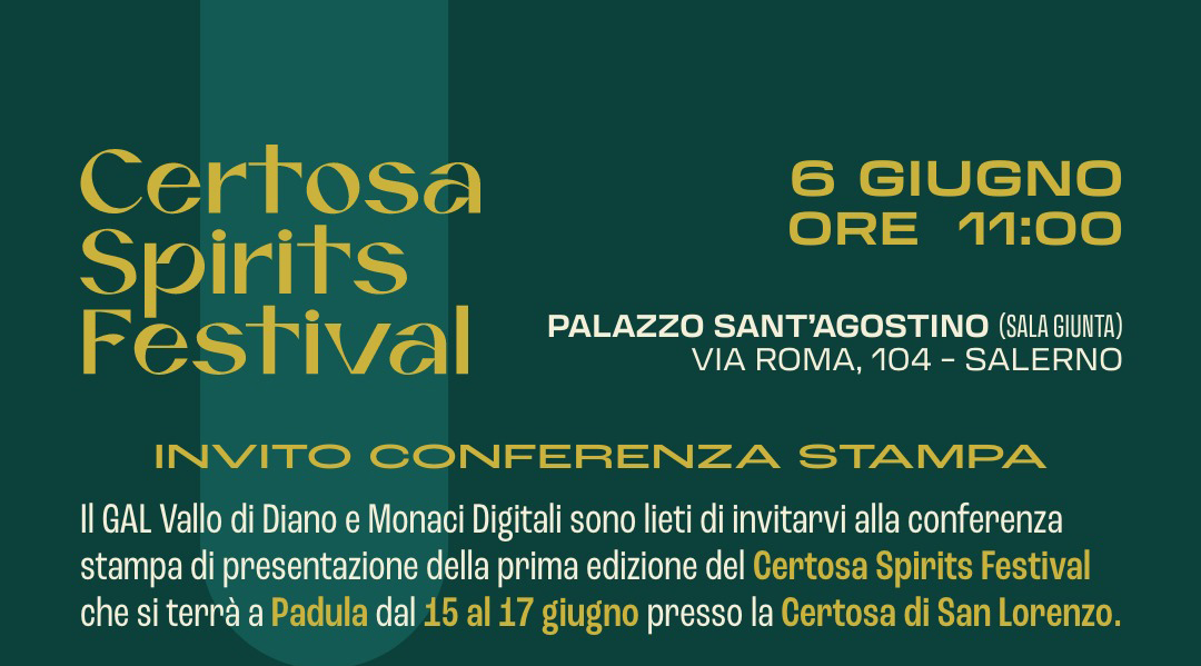 Il Gal Vallo di Diano e Monaci Digitali domani, 6 giugno, alle 11 a Salerno, presso Palazzo Sant’Agostino, presenteranno la prima edizione del Certosa Spirits Festival che si terrà a Padula dal 15 al 17 giugno presso la Certosa di San Lorenzo.