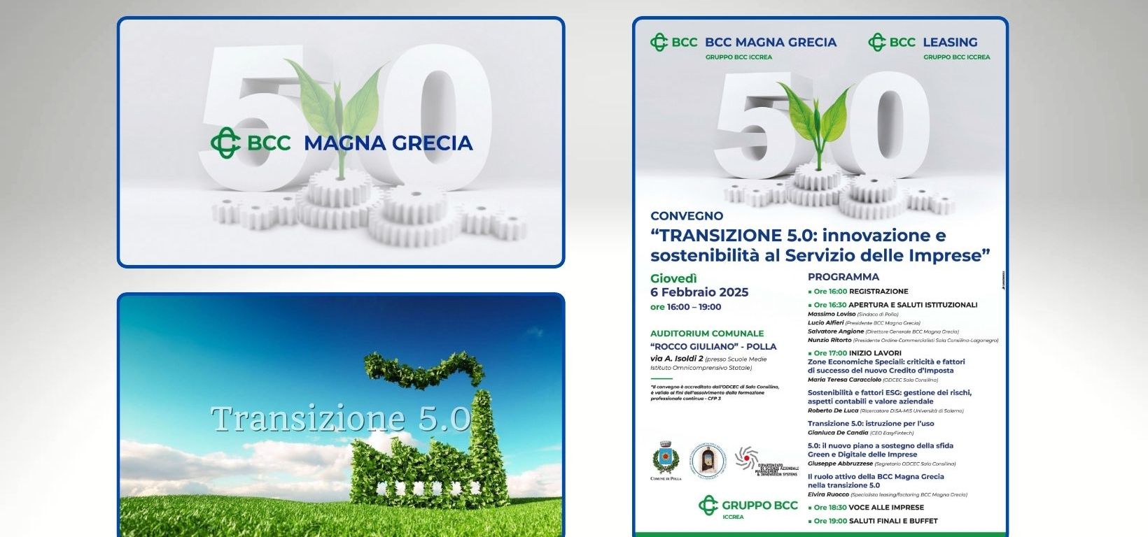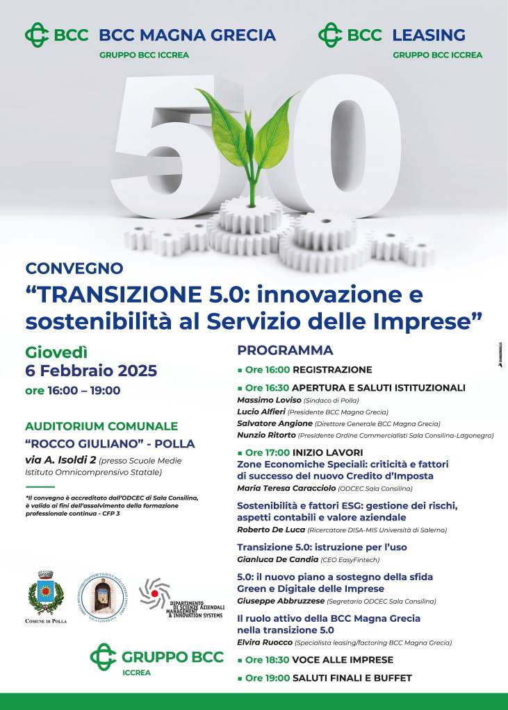 “Transizione 5.0: innovazione e sostenibilità al servizio delle imprese” è il tema di grande attualità oggetto del convegno organizzato dalla BCC Magna Grecia in collaborazione con l’Ordine dei Dottori Commercialisti e degli Esperti Contabili di Sala Consilina e con il patrocinio del Comune di Polla, ed in programma giovedì 6 febbraio alle ore 16:00 presso l’Auditorium Comunale “Rocco Giuliano” di Polla.