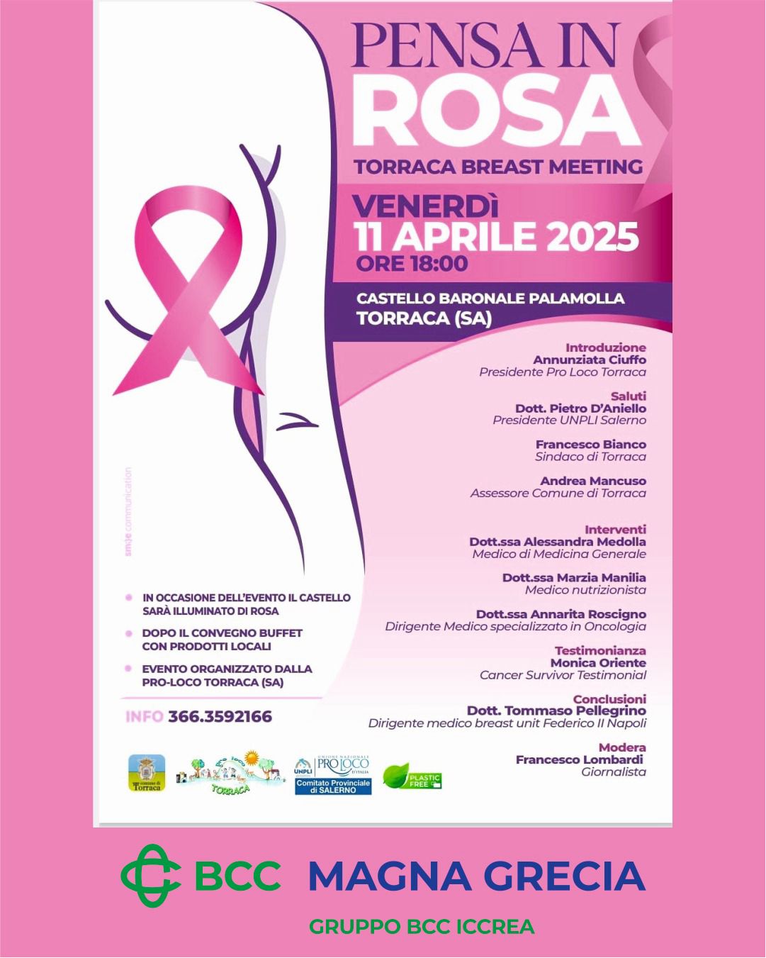 Il Castello Baronale Palamolla di Torraca si è illuminato di rosa per il “Torraca Breast Meeting – Pensa in Rosa”, un evento dedicato alla prevenzione del tumore al seno, promosso dalla Pro Loco di Torraca in collaborazione con UNPLI Salerno e il Comune di Torraca.