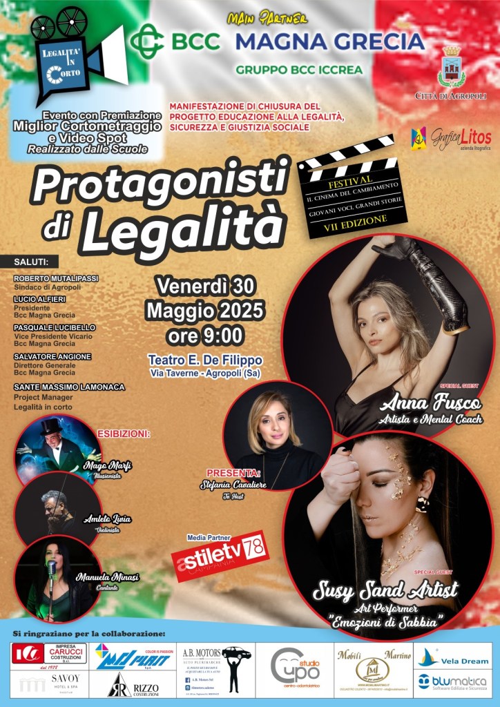 Cresce l’attesa per “Protagonisti di Legalità”, la manifestazione conclusiva del progetto “Legalità in Corto”, in programma venerdì 30 maggio 2025 alle ore 9:00 presso il Teatro “Eduardo De Filippo” di Agropoli. L’evento rappresenta l’atto finale della VII edizione del progetto nazionale “Educazione alla Legalità, Sicurezza e Giustizia Sociale”, con BCC Magna Grecia come Main Partner e il patrocinio morale del Comune di Agropoli.