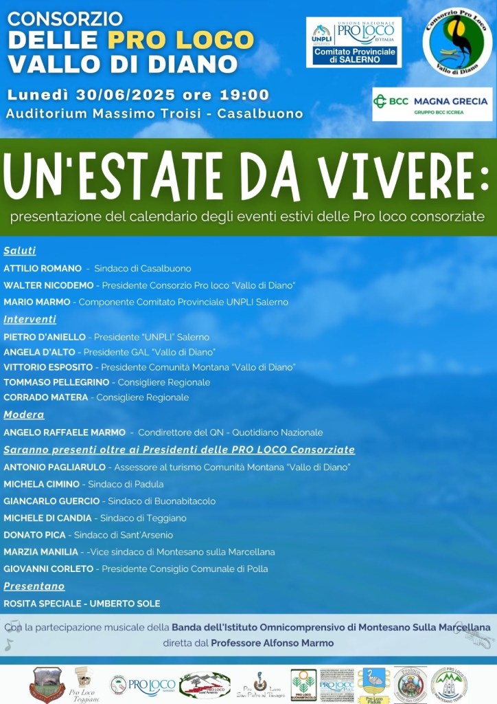 Una grande prima volta per le Pro Loco del Vallo di Diano, e un nuovo importante tassello per la valorizzazione del territorio. Si è svolta lunedì sera, presso l’Auditorium Massimo Troisi di Casalbuono, la presentazione congiunta del calendario estivo delle Pro Loco consorziate: un evento fortemente sostenuto dalla BCC Magna Grecia, da sempre al fianco delle realtà che promuovono cultura, socialità e identità locale.