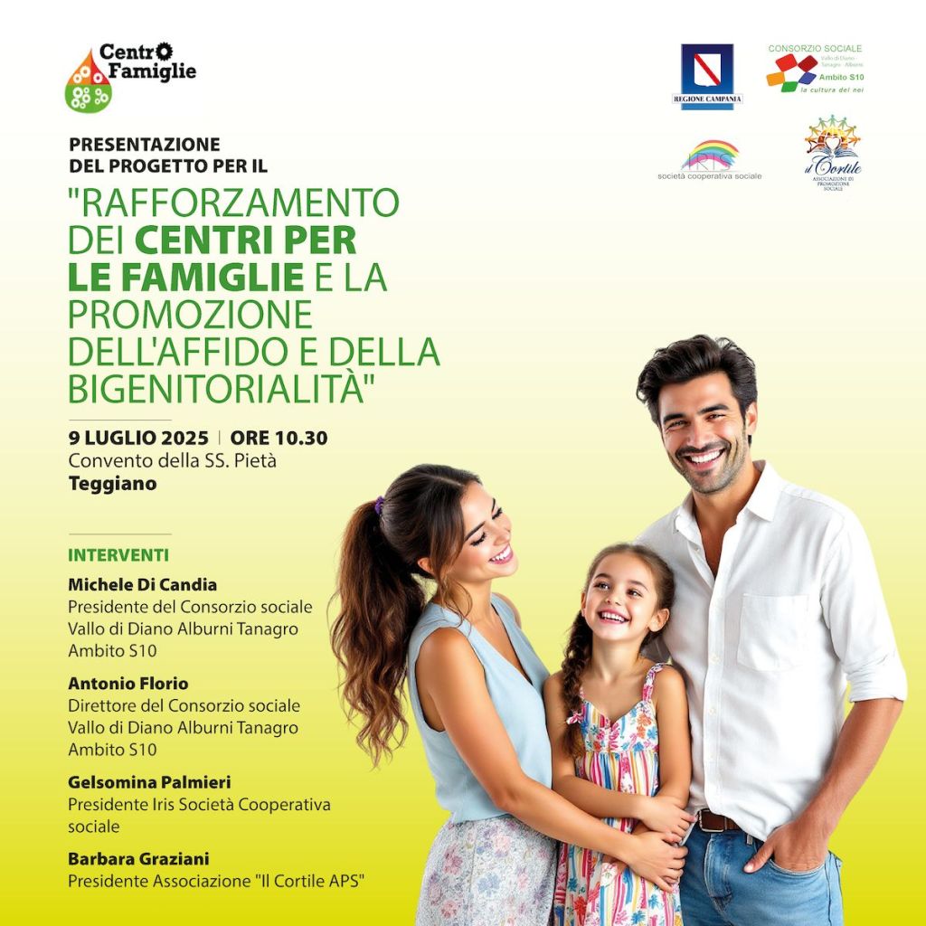 Il prossimo 9 luglio, alle ore 10:30, presso il Convento della SS. Pietà a Teggiano, saranno presentati i nuovi servizi attivati dai Centri Famiglia del Consorzio Sociale Vallo di Diano Tanagro Alburni – Ambito S10, grazie al sostegno della Regione Campania.