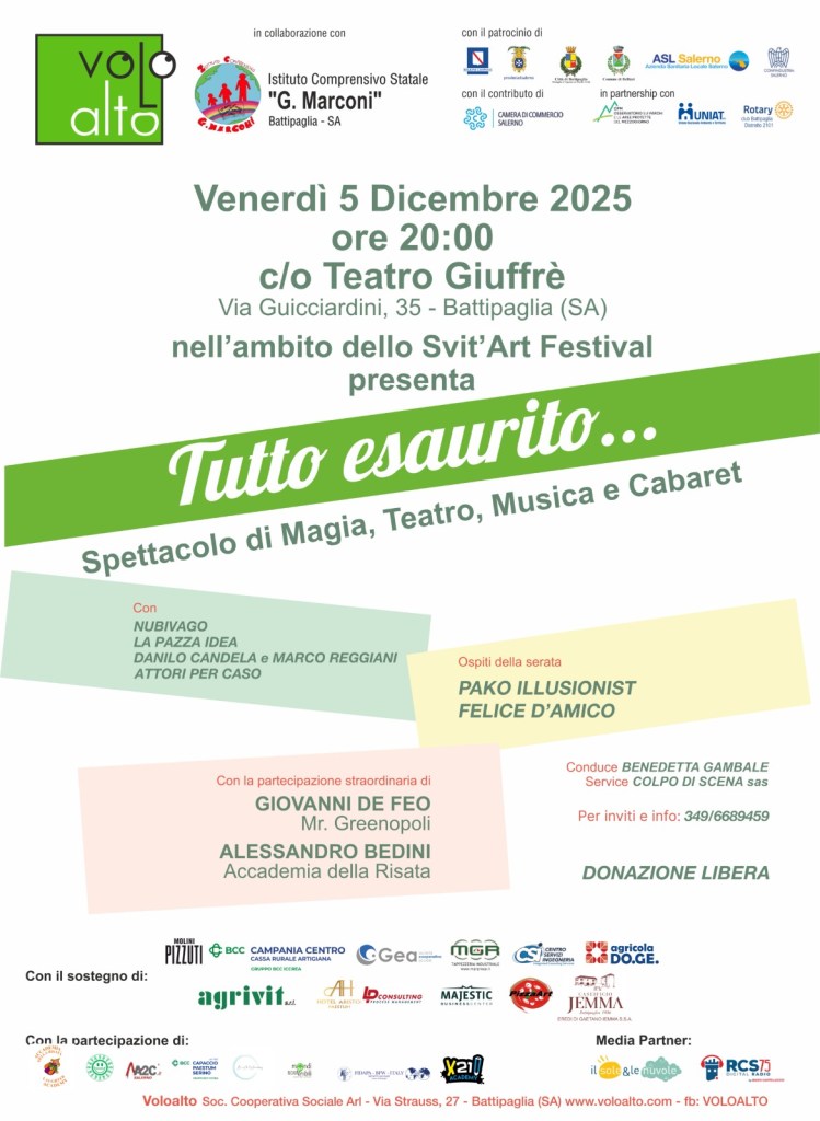Il programma prosegue con laboratori creativi e workshop esperienziali il 4 e 5 dicembre presso l’Istituto Marconi, per culminare venerdì 5 dicembre alle ore 20.00 al Teatro Giuffrè con Tutto esaurito…, spettacolo di beneficenza di magia, teatro, musica e cabaret, con Nubivago, la Compagnia teatrale La Pazza Idea, Danilo Candela e Marco Reggiani, Attori per caso.