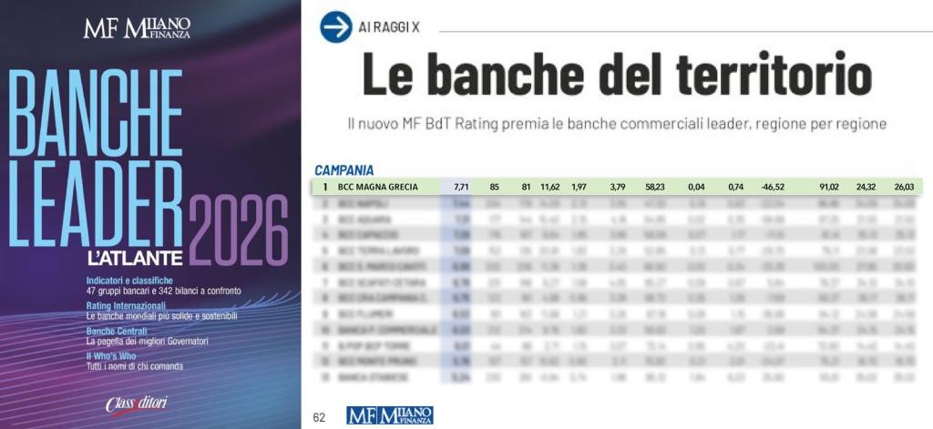 La BCC Magna Grecia si colloca al primo posto in Campania nella classifica “Le banche del territorio” pubblicata da Milano Finanza – Class Editori, nell’ambito del MF BDT Rating, lo studio dedicato alle banche commerciali con mezzi amministrati inferiori a 60 miliardi di euro. Si tratta di un risultato di grande rilievo, che certifica il valore di un modello bancario fondato su solidità, equilibrio gestionale e forte radicamento territoriale, capace di coniugare performance economiche e qualità dei servizi offerti a famiglie e imprese.