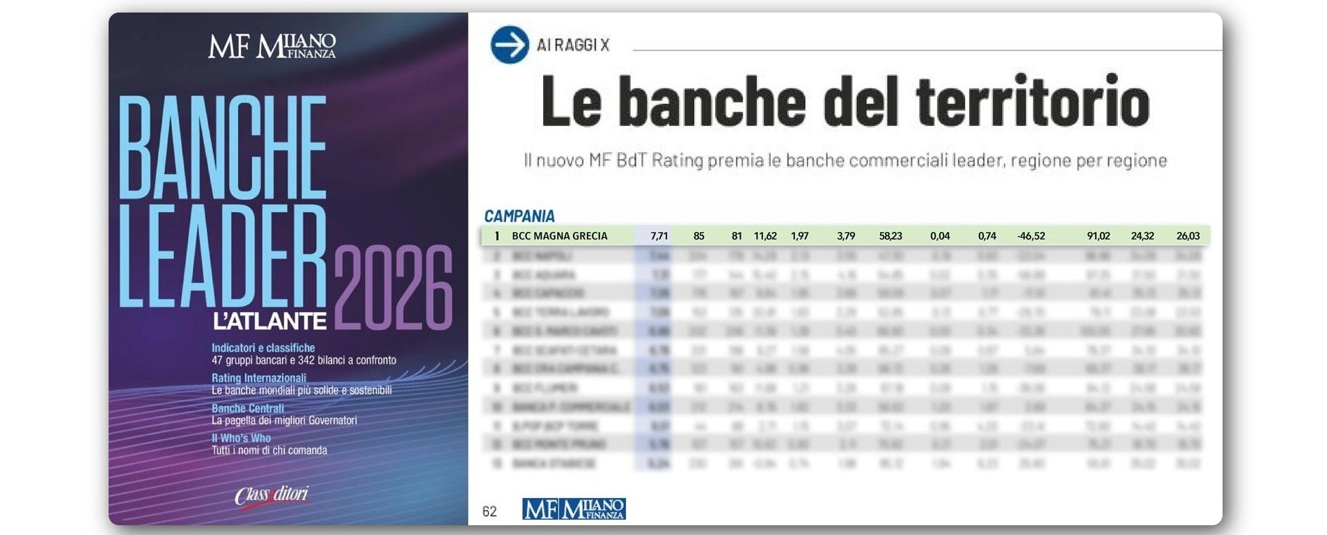La BCC Magna Grecia si colloca al primo posto in Campania nella classifica “Le banche del territorio” pubblicata da Milano Finanza – Class Editori, nell’ambito del MF BDT Rating, lo studio dedicato alle banche commerciali con mezzi amministrati inferiori a 60 miliardi di euro. Si tratta di un risultato di grande rilievo, che certifica il valore di un modello bancario fondato su solidità, equilibrio gestionale e forte radicamento territoriale, capace di coniugare performance economiche e qualità dei servizi offerti a famiglie e imprese.