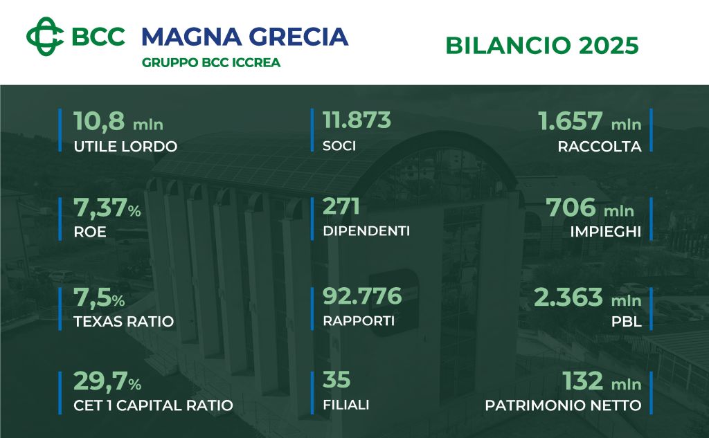 Oltre 1,7 miliardi di euro di raccolta, 127 milioni di nuove erogazioni a famiglie e imprese e un utile netto di 9,4 milioni di euro: sono alcuni dei dati più significativi che emergono dal Bilancio 2025 della BCC Magna Grecia, che conferma un percorso di crescita solido e continuo al servizio del territorio. BCC Magna Grecia chiude quindi il Bilancio 2025 con risultati importanti, consolidando e confermando la solidità del quadro tecnico aziendale. In un contesto economico e geopolitico particolarmente complesso, la Banca ha portato avanti con determinazione la propria missione di Credito Cooperativo, creando valore economico, sociale e culturale a beneficio di Soci, Clienti e comunità locali.