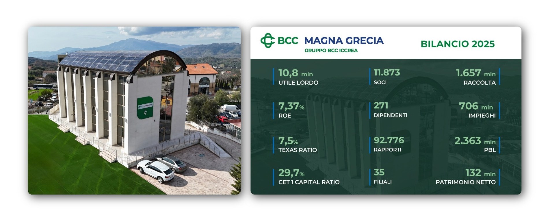 Oltre 1,7 miliardi di euro di raccolta, 127 milioni di nuove erogazioni a famiglie e imprese e un utile netto di 9,4 milioni di euro: sono alcuni dei dati più significativi che emergono dal Bilancio 2025 della BCC Magna Grecia, che conferma un percorso di crescita solido e continuo al servizio del territorio. BCC Magna Grecia chiude quindi il Bilancio 2025 con risultati importanti, consolidando e confermando la solidità del quadro tecnico aziendale. In un contesto economico e geopolitico particolarmente complesso, la Banca ha portato avanti con determinazione la propria missione di Credito Cooperativo, creando valore economico, sociale e culturale a beneficio di Soci, Clienti e comunità locali.