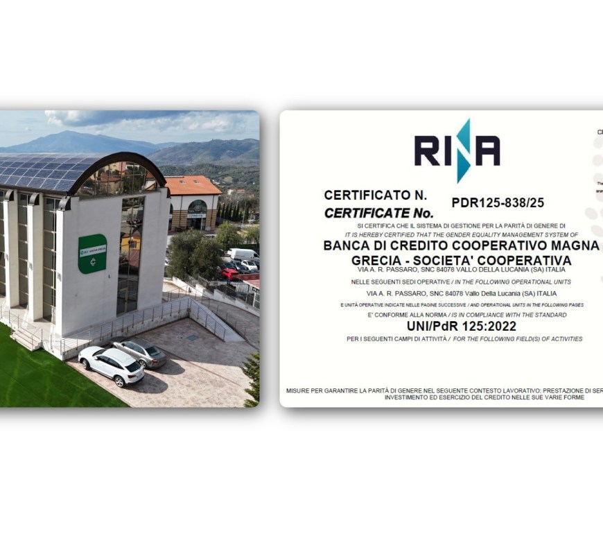 Il riconoscimento di un impegno concreto per un futuro più equo: la BCC Magna Grecia è stata ufficialmente certificata per la Parità di Genere secondo la UNI/PdR 125:2022, un traguardo che premia un percorso strutturato fondato su politiche aziendali inclusive, sostenibili e orientate alla valorizzazione delle persone. La Governance di BCC Magna Grecia annuncia con orgoglio il conseguimento della certificazione, che conferma la volontà della … Continua a leggere BCC Magna Grecia ottiene la Certificazione per la Parità di Genere: un riconoscimento ufficiale per l’impegno concreto rivolto a politiche inclusive e sostenibili